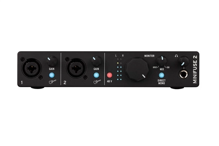 MiniFuse 2 został stworzony, aby proces nagrywania był prosty i efektywny. Wyposażony w dwa wysokiej jakości przedwzmacniacze mikrofonowo-instrumentalne na złączach combo (XLR/TRS), pozwala na jednoczesne podłączenie mikrofonów, gitar czy syntezatorów. Każde wejście dysponuje zasilaniem phantom +48V, co umożliwia pracę z mikrofonami pojemnościowymi. Interfejs oferuje studyjną jakość dźwięku z zakresem dynamiki na poziomie 110 dB oraz wyjątkowo niskim równoważnym szumem wejściowym (EIN) -129 dB. Oznacza to, że każde nagranie jest krystalicznie czyste, pełne detali i wolne od niepożądanych zakłóceń. Na panelu przednim znajdują się podświetlane pokrętła wzmocnienia, które zmieniają kolor na czerwony przy zbyt wysokim sygnale, oraz precyzyjny miernik VU, co ułatwia kontrolę poziomów. Dodatkowo, wbudowany hub USB-A pozwala na podłączenie kontrolera MIDI lub innego urządzenia peryferyjnego, oszczędzając porty w komputerze.