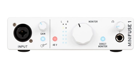 MiniFuse 1 został stworzony przez ekspertów audio, aby zapewnić najlepsze możliwe brzmienie w swojej klasie. Urządzenie charakteryzuje się zakresem dynamiki na poziomie 110 dB oraz wyjątkowo niskim ekwiwalentnym szumem wejściowym (EIN) wynoszącym -129 dB. Oznacza to, że każde nagranie jest krystalicznie czyste, pełne dynamiki i wolne od niepożądanych zakłóceń. Interfejs wyposażono w jedno wejście combo XLR / 1/4’’ jack, które umożliwia podłączenie zarówno mikrofonu, jak i instrumentu. Podświetlane pokrętło Gain informuje o poziomie sygnału, zmieniając kolor na czerwony przy przesterowaniu, co ułatwia kontrolę nad nagraniem. Funkcja Direct Monitor pozwala na bezlatencyjny odsłuch sygnału wejściowego, a wirtualny kanał loopback umożliwia łatwe nagrywanie dźwięku z komputera – idealne rozwiązanie dla podcasterów i streamerów. Dodatkowy port USB-A pozwala na podłączenie kontrolera MIDI lub innego urządzenia, oszczędzając porty w komputerze.