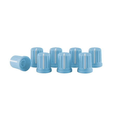 - Zestaw 8 niebieskich nakładek na potencjometry z gumowaną powłoką. Ergonomiczny kształt i jaskrawa kolorystyka ułatwiają obsługę sprzętu DJ w ciemnych warunkach. Pasują do wszystkich potencjometrów z osią typu D-Shaft. Idealne do personalizacji setupu.