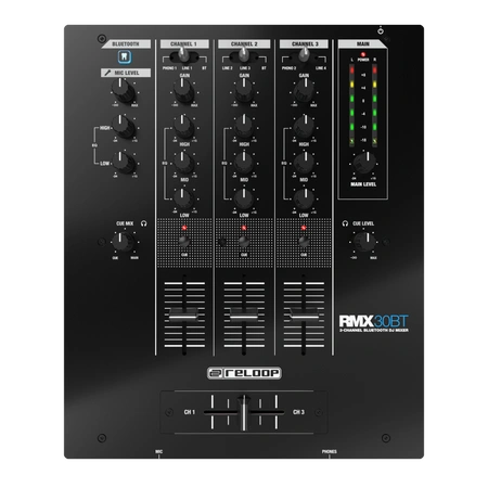 - Reloop RMX-30 BT to 3-kanałowy mikser DJ z wbudowanym interfejsem Bluetooth, umożliwiający bezprzewodowy streaming muzyki. Oferuje 8 wejść, wyjścia XLR/RCA, 3-pasmowe EQ oraz wymienny crossfader. Idealny do domowego studia i na małe imprezy.