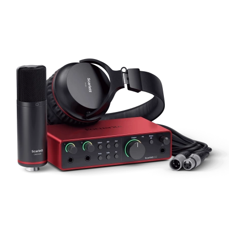 - Kompletny zestaw do nagrywania wokalu i instrumentów. Zawiera interfejs audio USB-C 2x2 Scarlett 2i2 4th Gen, mikrofon pojemnościowy CM25 MkIII, słuchawki studyjne SH-450 oraz bogaty pakiet oprogramowania. Idealny do domowego studia i dla artystów.